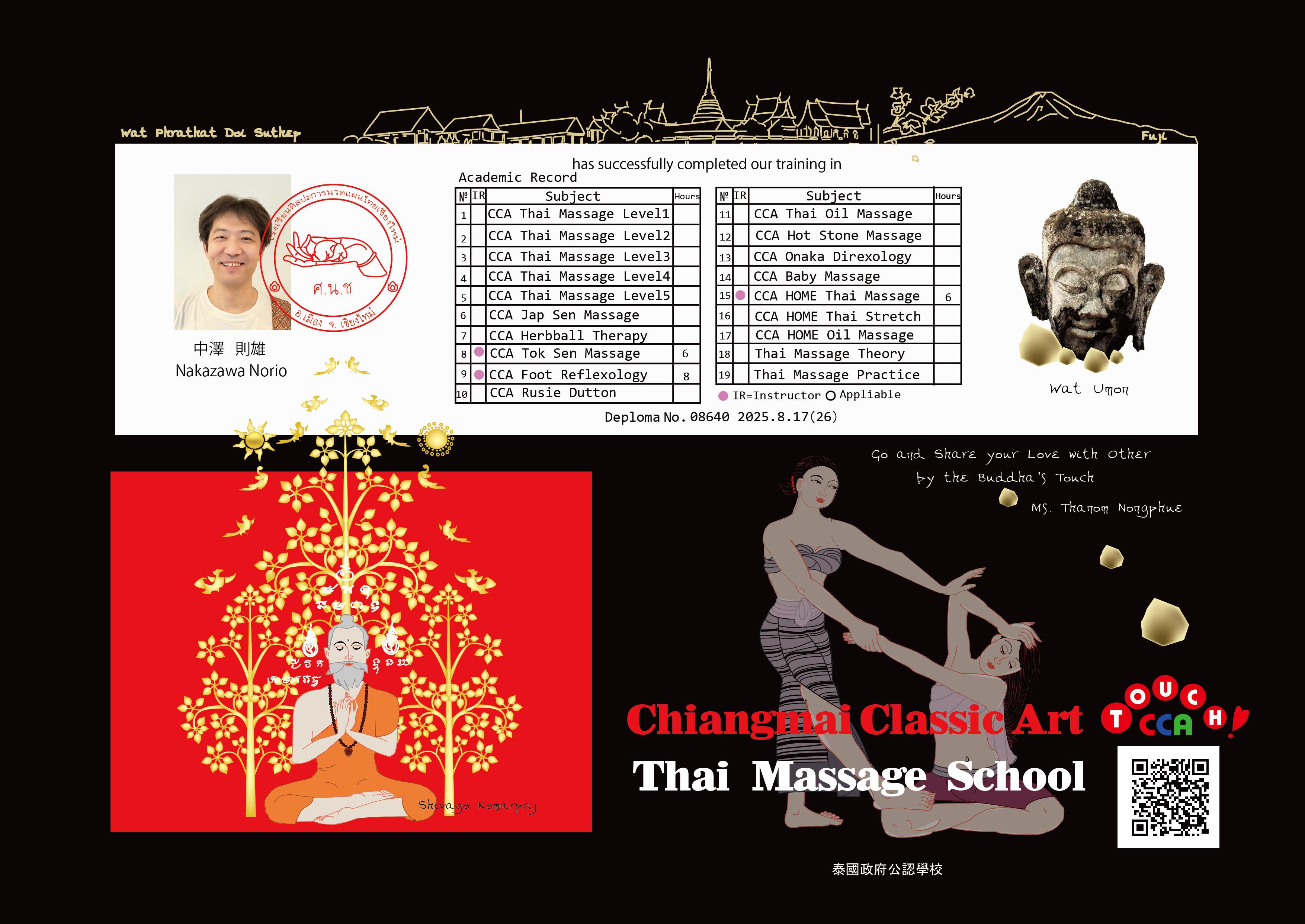 授業では、仰向け・うつ伏せ・座位といったタイ古式マッサージの基本姿勢をひと通り体験しながら学んでいきます。流れの中には、実際の施術でもよく使うテクニックや、日常的な疲れを癒すのに役立つポイントがたくさん盛り込まれており、短期間でありながらボリュームのある内容になっています。 「タイ古式マッサージに興味はあるけど、まずは入口として触れてみたい」という方にはぴったり。また、修了後にはインストラクターの申請も可能なので、学んだ技術を活かして人に教える道へ進むこともできます。 ご家族や友人など身近な方へのケアにすぐ活かせるのはもちろん、セラピストとして本格的に学んでいくためのステップとしてもおすすめです。気軽に学べて、でもしっかり身につく。そんな講座です✨ ※卒業後はタイ政府認定校CCA(チェンマイクラシックアート)からディプロマが発行されます |