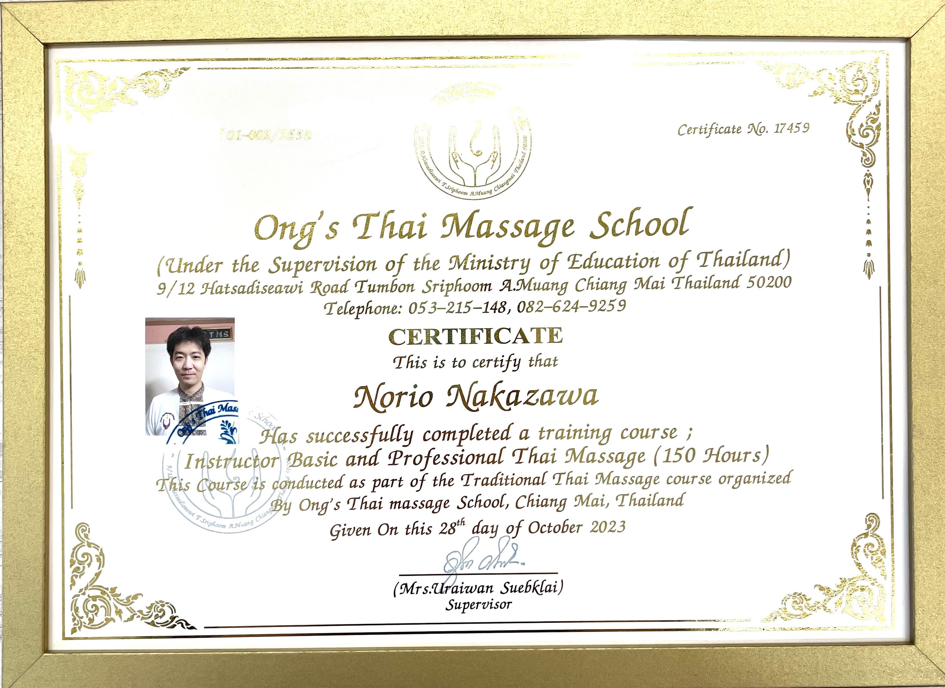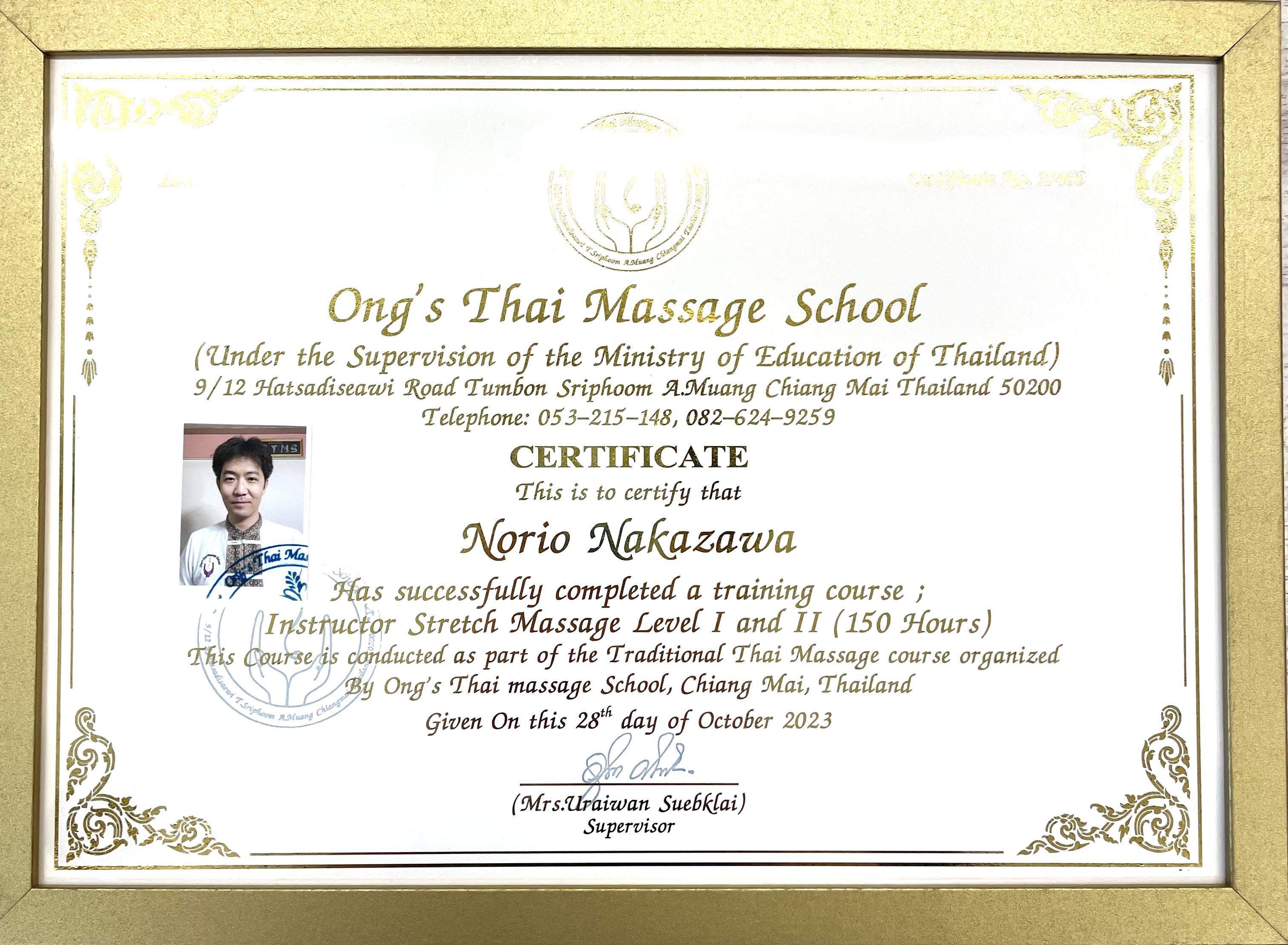 タイマッサージならではの伸びや気持ちよさを感じてもらえる技が多く、施術の幅が一気に広がります。 「もう少しダイナミックに伸ばしてあげたい」「しっかり効かせたい」という時に役立つ内容です。 ベーシック・プロフェッショナルと合わせて学ぶことで、施術にメリハリが出て、より満足度の高いセッションが提供できるようになります✨ 特にセラピストを目指す方には、3つセットでの受講がおすすめです。 ※卒業後はタイ政府認定校のOng’sタイマッサージスクールの修了証(ディプロマ)が発行されます。 |